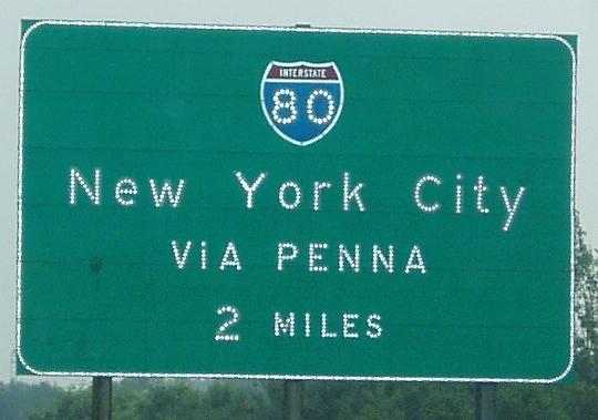 The first and last photo are courtesy Bill Donovan, and the middle two (really from the same photograph) are courtesy Scott Colbert. I'm not quite sure what VIA PENNA means, as there's no other way to NYC without detouring far south to WV, MD, and DE. Maybe they were trying to think of what I-80 is called in Pennsylvania, which is... I-80. You also see, at the point where OHDOT dutifully switches mileposting from I-76 to I-80 (technically right in the middle of the underpass), that once again the mileposts from the edge of Mahoning County have been adjusted upward by .03 since the days of I-80S. Maybe the whole highway shifted west by 160 feet....