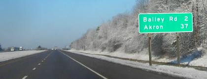 Westbound to the beginning of the I-76/77 duplex, with the last photo on the Exit 23A ramp as I reenter Akron. The snow's quite visible here.