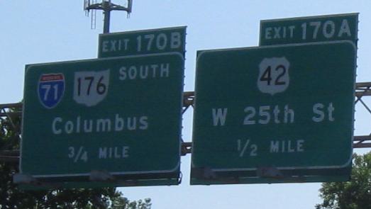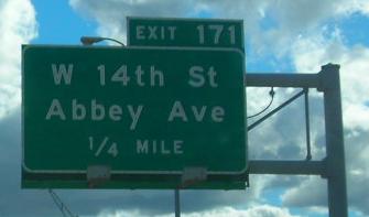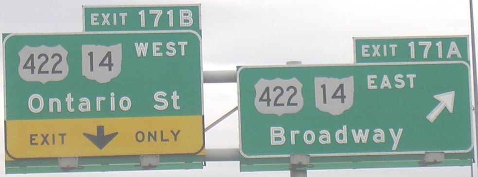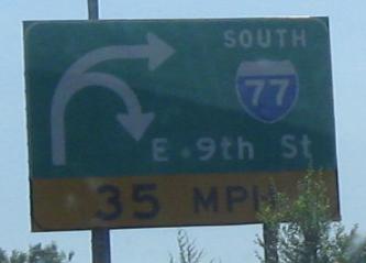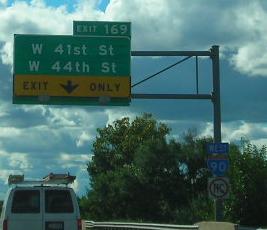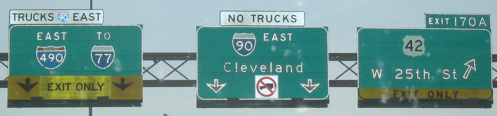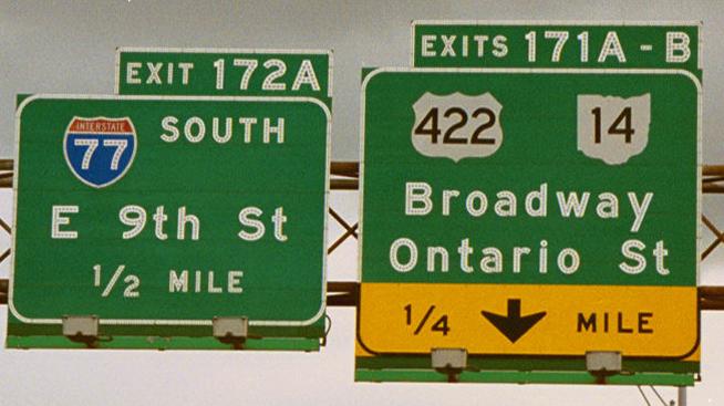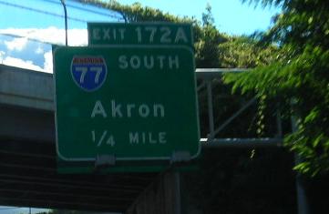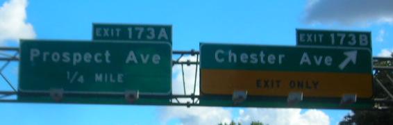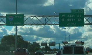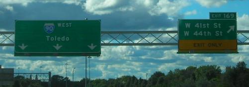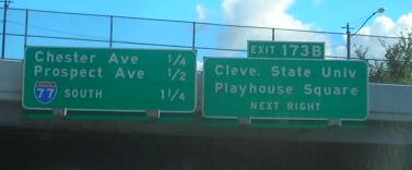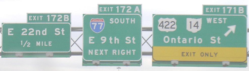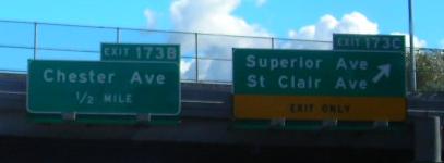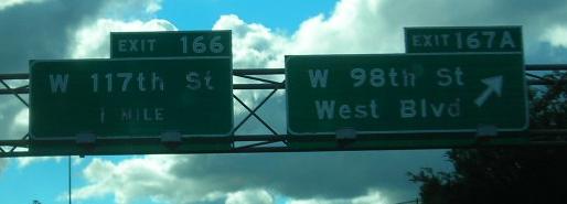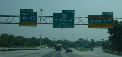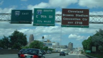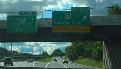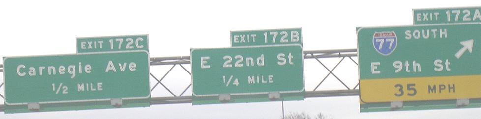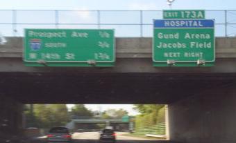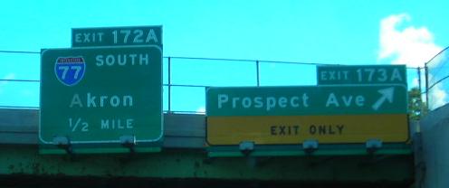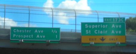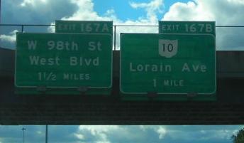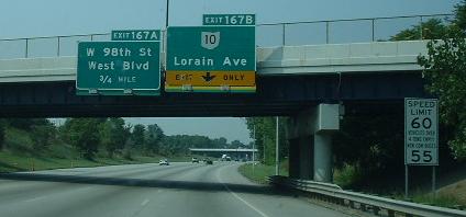 85th St. SB at Exit 167, turning into 84th St., courtesy Doug Kerr. In this part of Cleveland, the grids don't match up on either side of I-90, and there are several streets missing on either side.