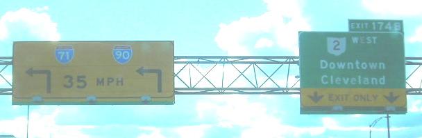 Westbound in Cleveland on the more heavily traveled duplex, courtesy Doug Kerr. This is also the more famous one, because it ends at Dead Man's Curve. I've mentioned that name enough on the OH 2 page, and the last photo gives you an idea of why it's called that. You can click on the last photo for a newer version that replaces part of the OH 2 sign (and takes away one sign from OH 2 WB) but better shows the light-up chevrons installed along the curve. At 35 MPH, Dead Man's Curve is way substandard for the mainline of an Interstate (it wasn't supposed to be the mainline - see commentary on the OH 2 page "between I-90 concurrencies," linked at bottom) - and the connector from OH 2 to I-271 at the eastern end of the multiplex isn't much better. Both ends of the multiplex favor OH 2 as the through route at least in theory, since that was the original road along Lake Erie, but the lane balance tends to favor I-90. I-71 is signed as being multiplexed with I-90, when it should be signed TO I-71 SOUTH. Now that I've finished typing all that, notice the California-style distance sign in the very first photo.