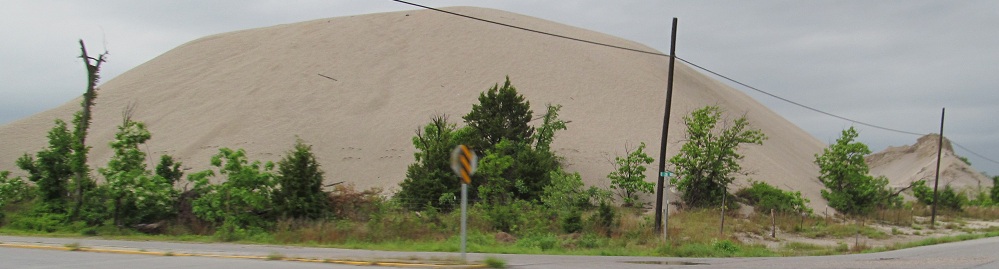 Picher was abandoned because lead and zinc mines tore away all of the ground beneath, making it unsafe for houses but apparently just fine for driving on paved roads. Fun stats: 34% of children had lead poisoning, 86% of buildings were seriously undermined (literally), and a tornado took out over 100 houses in 2008. I think I wasn't aware of why it was abandoned at the time, or I might not have ventured quite so deep into it. Speaking of lead and zinc, that's what you'll find in the giant sand piles seen here on the west side of US 69 - mine tailings with all sorts of interesting substances inside. Bon appetit!