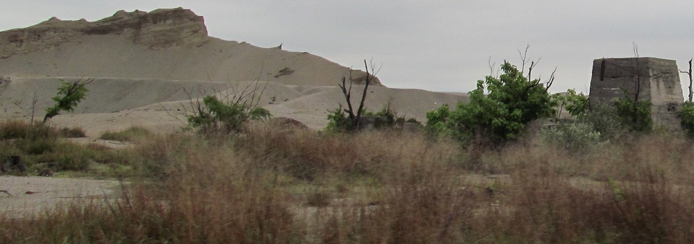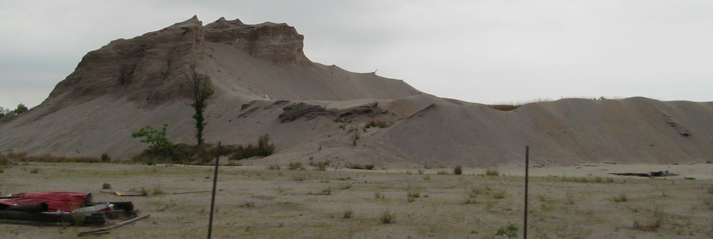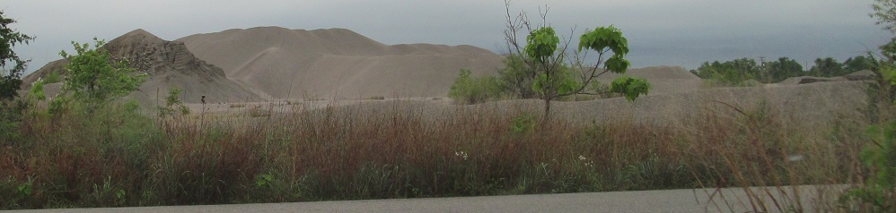 The tailing piles have gotten so large, they've started to form sandstone poisonleadstone cliffs. The railroad is somewhere within the mine property, where I'm not going.