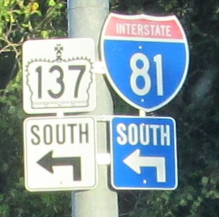 Continuing east to the major junction of the route and perhaps the only standalone Highway 137 shields in the province. These are also likely the only I-81 shields anywhere with a combined SOUTH and arrow in the banner (that's an Ontario style, but most I-81 shields in Ontario are on guide signs).