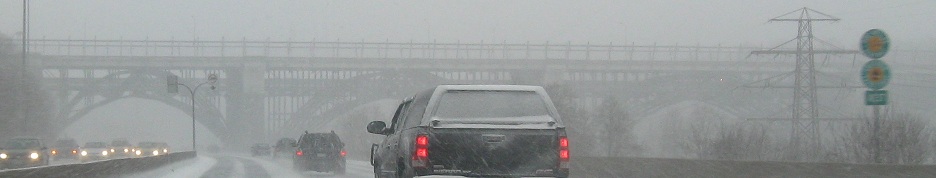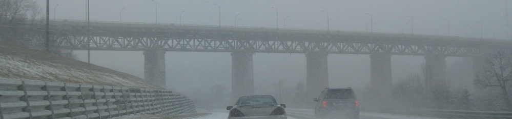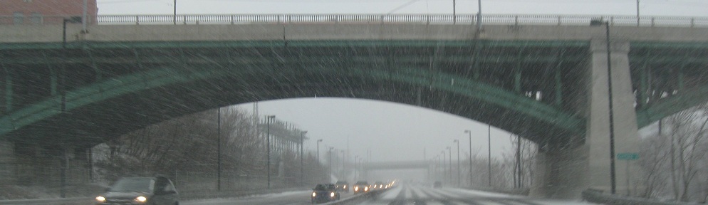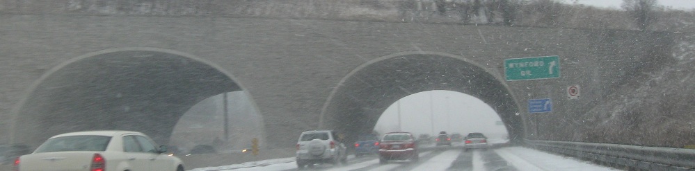 Much of the southbound Parkway is signed to Gardiner Expwy., which whisks people into downtown or past it and out the west side of Toronto. Because of the snow, I'll describe it to you: Inside the Don Valley Pkwy. shield is the word SOUTH, saving space on having a directional banner. Right below it is Gardiner Expwy. with an arrow inside, again saving a banner, but then the WEST beneath it as a modifier. Problem is, there's so much space being saved that the West becomes ambiguous and ends up contradicting the South. Get rid of the arrow, swap out the West and stick a TO between the shields, problem solved.