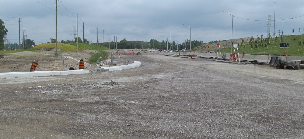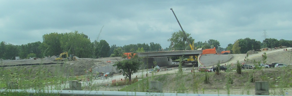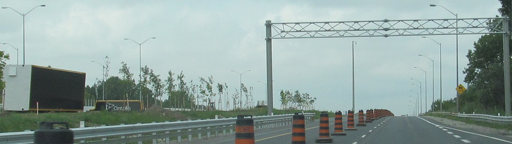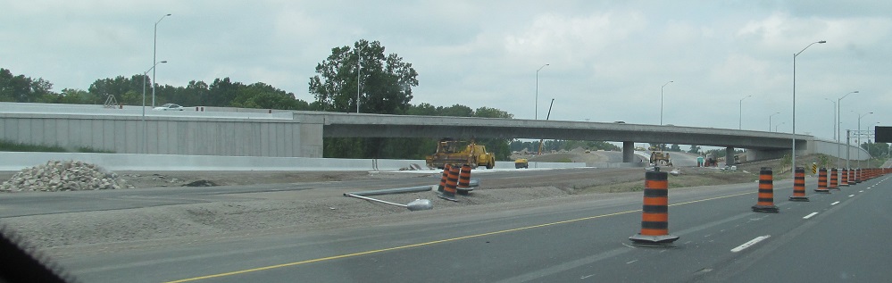 Starting east through Highway 401 construction to the Matchette Rd. overpass and future onramp to the E.C. Row. The 401 is being built in the median of E.C. Row ahead with an EB exit and WB entrance in this stretch.