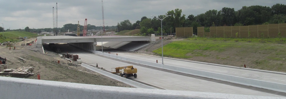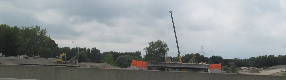 As the E.C. Row Expwy. EB crosses back over the new Highway 401, you can see the first two of 12 cut-and-cover tunnels under construction. The first is a path crossing while the second goes under Highway 3 SB and Labelle St.