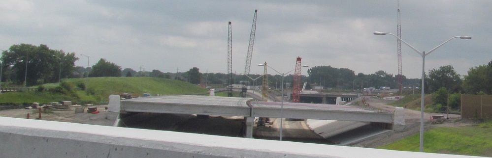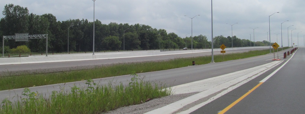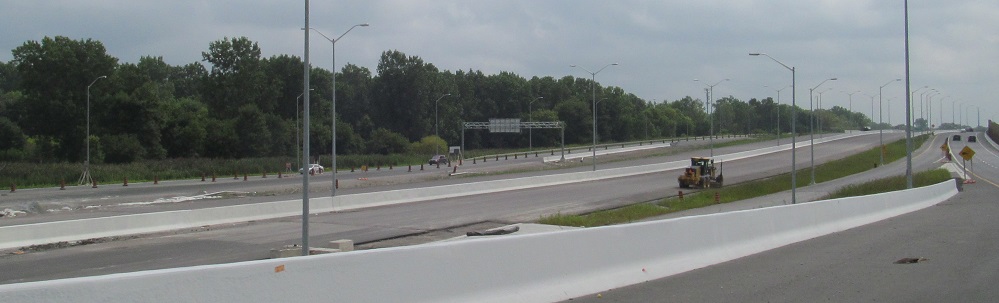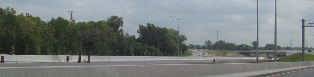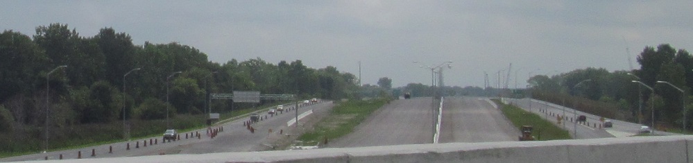 Now let's travel west through that whole work zone and see if you remember everything I taught you. You also get the bonus of a new VMS gantry on this side in the middle of assembly and a view of the Malden Rd. underpass before the highway trails off south under Matchette Rd. The WB onramp looks most inviting.