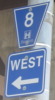 Coming off Burlington St. WB (briefly a freeway in eastern Hamilton), this shield points down Kenilworth Ave. although it has no highway designation. Hamilton Road 8 is actually down on Main St., former Highway 8 that once continued to the Niagara Regional as what is now RR 81. Hamilton is just a city, not a region or even a rare county, but it has enough pull to designate its own routes. The shields are the same shape as most regions but blue like the ones Niagara Region used to use. They also have a stylized city logo instead of block lettering, but that may be within the liberties most regions take with their designs.
