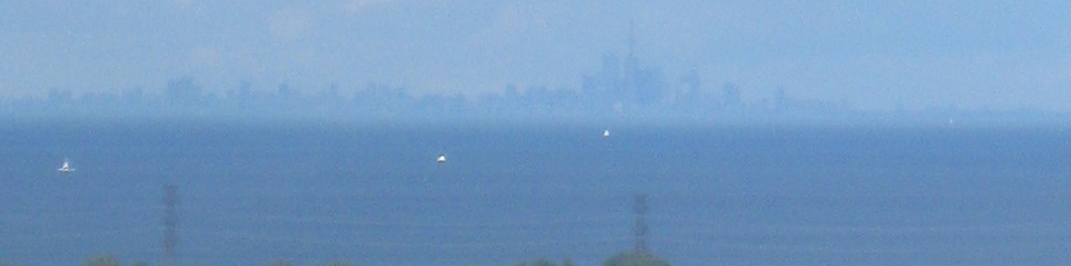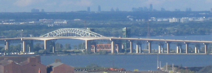A closeup of the QEW crossing the Burlington Bay Skyway, and behind it the original Burlington Lift Bridge on Beach Blvd. Looking farther back, I can barely see the Toronto skyline across Lake Ontario, including the CN Tower just to the right of center towering shadowily.