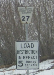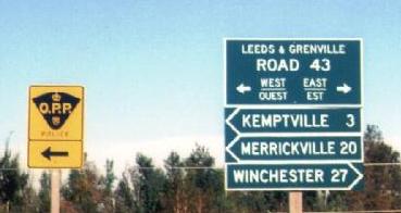 In the United Counties of Stormont, Dundas, and Glengarry, which considers itself a singular county when required to be a noun, courtesy Lou Corsaro. This just seems exceptionally rare because I've never come across a font like this in Ontario, either for its deviation from the standard or for seeming to be painted on. I wouldn't be surprised if this sign dates to the 1960s.