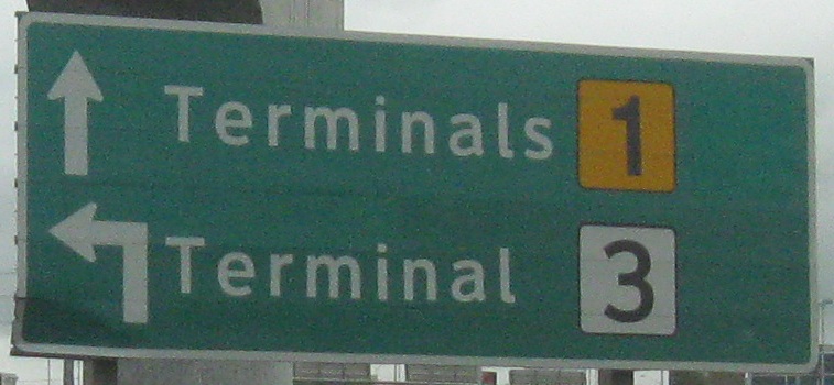 Airport Rd. (RR 7) SB outside Pearson International Airport. Clearly Terminal 2 was a recent casualty, although a little more effort could have been done to green out the "s" in "Terminals."