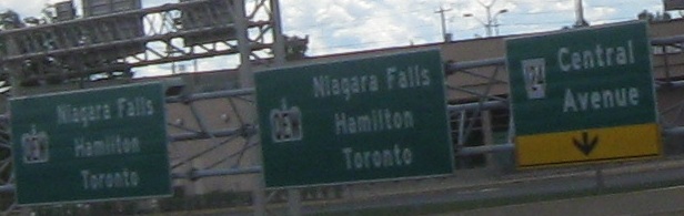 Another thing to point out, perfectly illustrated past the end of Highway 405, is that the QEW is not signed east-west like other highways. It's signed Toronto-Niagara, which works fine in conversation (Niagara-bound versus eastbound, you can live with) but does not translate easily to this page (I was traveling NB - no, not northbound, in fact it's more southward than anything - then I came back TB...). I'm inclined to consider the highway east-west, and there's a good argument for north-south, but the highway just isn't complicated enough for special directions. Clearly, the fact that it's named after Her Royal Highness the Queen Mother Queen Elizabeth (or some such moniker) has given the highway an inflated sense of importance such that it cannot deign to be signed by plebeian directions. Or else the freeway is so old that it predates the concepts of east and west. For the rest of this page, Toronto is west and Niagara (Falls) is east, and you'll like it.