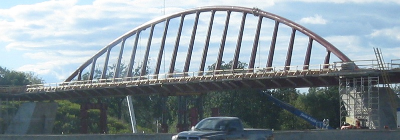 WB and EB sides of a new pedestrian crossing just east of the Burlington Street mini-freeway. The EB side shows the considerable tilt in the unique arch.