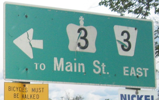 The shield atop the page looks north from the end of RR 5 (Killaly St.) on Mellanby Ave., and this photo looks east from there. Highway 3A led down from Highway 3 via Mellanby Ave. and ended at Welland St./RR 68. Now, it leads down from RR 3, turns back up Welland St. and ends in a long loop. Highway 3 has been dropped in status, and RR 68 disappeared completely. Also, RR 5 was extended on a newish bridge to get onto "The Island" and meet 3A.
