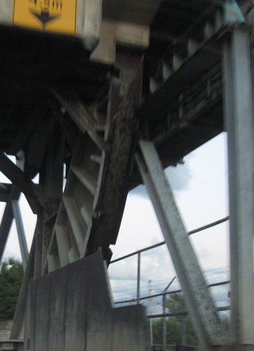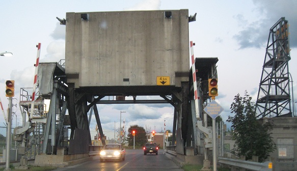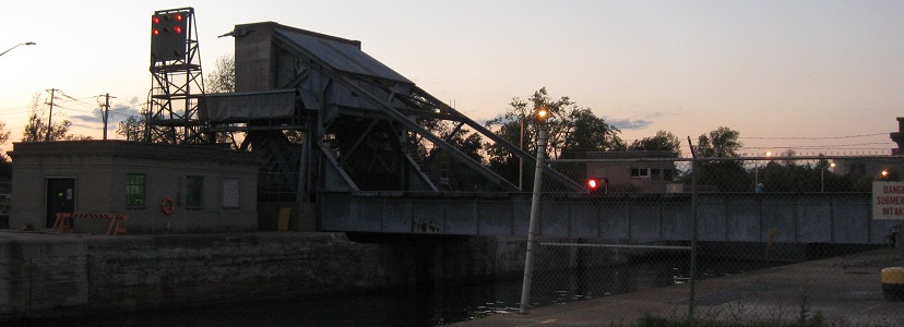 Looking north at the bridge. That big structure you may have noticed to the right of the bridge appears to be a lock signal supplementing the little one in the middle of the span. Unlike most drawbridges, this is a single lift span; when the weight drops on the west side, the entire bridge raises up over it.