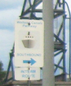 Across the Welland Canal. The other half of the canal forming "The Island" is the former route, originally constructed to avoid blasting the canal through bedrock but cutting a more circuitous route. It's no longer possible to boat the whole thing, but it's probably safe to head up to the old lock at RR 3. The Welland Canals Parkway is related to Welland Canal Pkwy. (no reckoning for the missing/added 's'), but there's a considerable distance through Thorold and Welland to get it down to this sign. Interim status is likely to continue for quite awhile.