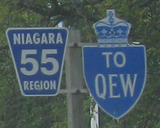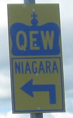 WB and EB. The QEW should be using a more stately, taller font (featured on many other pages, but here's one example) because it's the Queen's highway and queens are stately (though in this case, not taller). It should also be using a crown shape with ridges that looks more like a crown and less like a Mallomar. Can't expect much from a non-cutout assembly, though. This is the best example on my website of the Toronto/Niagara directions applied to the QEW instead of the expected west/east or still acceptable north/south. Ontario hides behind the excuse that the shoreline of Lake Erie is too curved to allow directions, but I say they just want to make the QEW that much more stately.