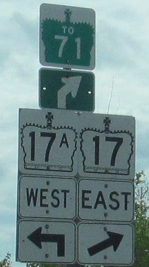WB on what may not be Highway 17 very much longer, at what is no longer Highway 15 east of Arnprior. This piece was left stranded when Highway 417 was extended, but for whatever reason it wasn't decommissioned (Canadians prefer the term "downloaded") right away. Ontario wouldn't think of connecting it along former 15 back to 417, because that would mean reassuming maintenance of the small bit of 15 (under a kilometer). (I wanted to type "kilometre," but then I'd have to hunt down words like "colour.") That leaves Highway 17 as bizarrely ending by a sign that tells you how to continue on it.