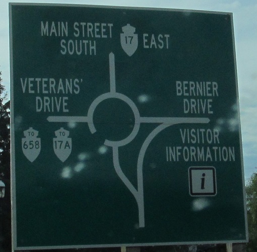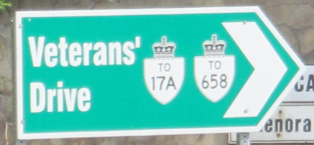 I can't even with this Kenora roundabout. It insists that Highway 658 is a primary route, not secondary. It includes apostrophes in street names. It has to tell you what a yield sign means. It can't decide on the font or capitalization. And somehow, there's still an old notched-7, straight-1 shield at the entrance.