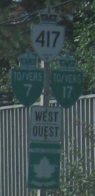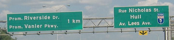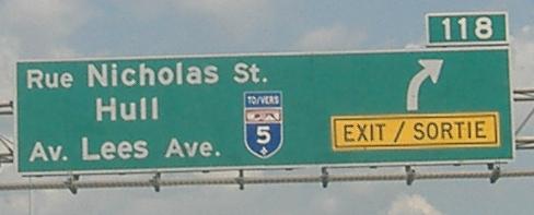 Yes, even though Highway 417 is an east-west freeway, it's numbered as if it runs north from the Québec border, and thus numbers decrease instead of increase as one heads east. To mimic Québec's TO/VERS plate, and follow the unique EXIT/SORTIE and ugly new exit arrow off to the right, one must use local streets like Nicholas St. to connect from this freeway to Autoroute 5. It appears there may have once been plans to connect them, but I don't think they will ever gain traction. Photos of the ghost ramp coming in from the right, which may have been from Lees Avenue or, more likely, signaled a potential southward extension to the current mini-freeway at the exit, are courtesy Lou Corsaro.