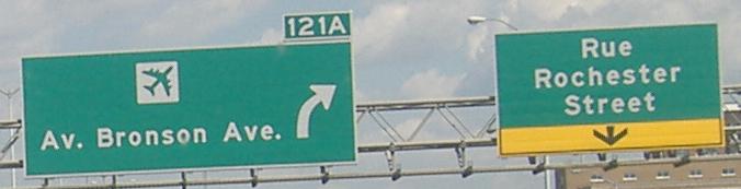 Avenue Atwater Avenue - bilingualism TO THE EXTREME!! The first, more modern photo show the new style of exit arrow (in yellow) that Ontario is keen on and I'm much less so. The older photo, courtesy Doug Kerr, still signs the Regional Road number for Exit 121, and has a cool diagrammatic to go with it.