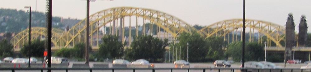 The rest of the 16th St. Bridge, southbound. Those appear to be Pegasi (or pterippi, if you're a purist about Greek mythology) holding up a world of other strange creatures. Like the Three Sisters bridges to the west and the two I-279 bridges (Forts Pitt and Duquesne), this one is painted Pittsburgh yellow.