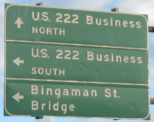Canal St. SB coming from 2nd St. It's not button copy, but it's just barely newer than that. Business US 222 was created in 1977, and I bet this sign was up in 1976 for it. The Bingaman St. Bridge is Business 222, visible in the background.