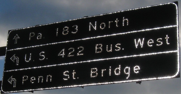 The refurbished lamppost that matches the ones on the bridge is on the northwest corner of these streets, the east end of Penn St. Business US 422 EB is still on Franklin St., but the WB side comes through here and jogs north on 11th St. to Washington St.