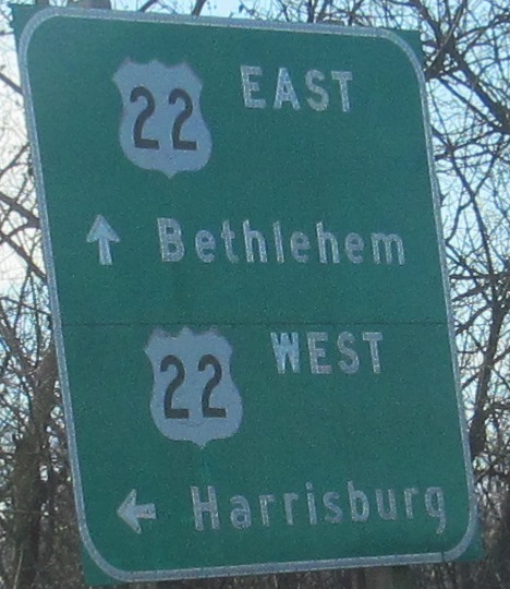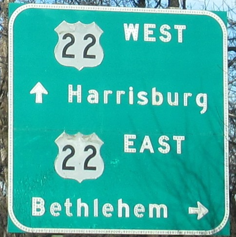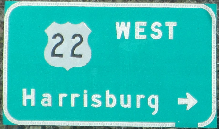 Northbound button copy, with the last sign mounted under the US 22 West BGS. It's supposed to be pointing to the right as well, but hard to see behind the guiderail.