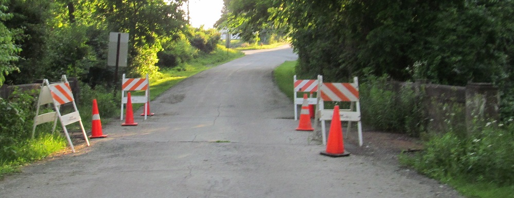Old US 22 crosses a 1924 bridge as it heads east from White Thorn Rd. on a dead end. Your choice of an old bridge plaque on the right or deteriorated concrete on the left.
