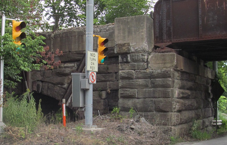 New, but ugly, Turnpike shields flank much older stuff. The railroad bridge is at the brief PA 73 concurrency.