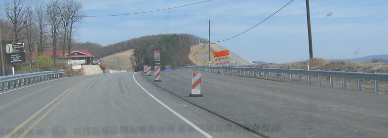 Up above I-99, old 322 appears to be under construction for a new four-lane highway. I don't think this is actually the case, but rather that with so much rock removed to put the highway below, additional construction was needed to stabilize the slope, regrade the road, add guiderail, etc. These photos face eastbound, which is the side that was closed.