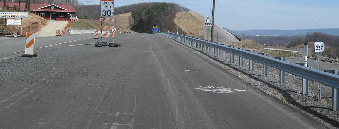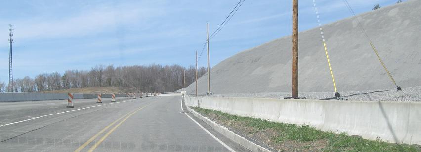Heading west from State College on SR 3042. The first photo looks west on the new I-99/US 220/US 322 freeway, the last segment to be completed south of I-80 (other than the interchange there). A mountain of acid rock treatment rises in the background - more on that in a bit. The second photo is at Sellers Lane, which passes through a gap under that same freeway.