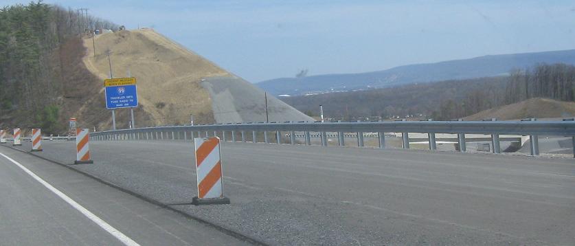 Looking SB (west or even northwest in cardinal direction) on I-99/US 220 and WB on US 322. These slopes were done first with a darker rock, and are clearly finished (whereas not all of the other slopes are, with some tarp still showing through). The Port Matilda bypass half of new I-99 opened up to here a year or two before the descent into State College could be opened.