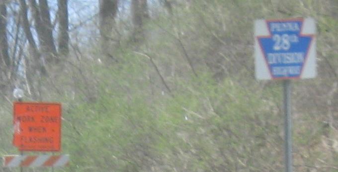 Continuing west, US 322 is normally the 28th Division Highway, but here it follows the old road instead. Here's another huge pile of rocks serving as acid rock treatment, shoring up I-99 instead of being piled on the slopes above. Two more captions and I'll explain.