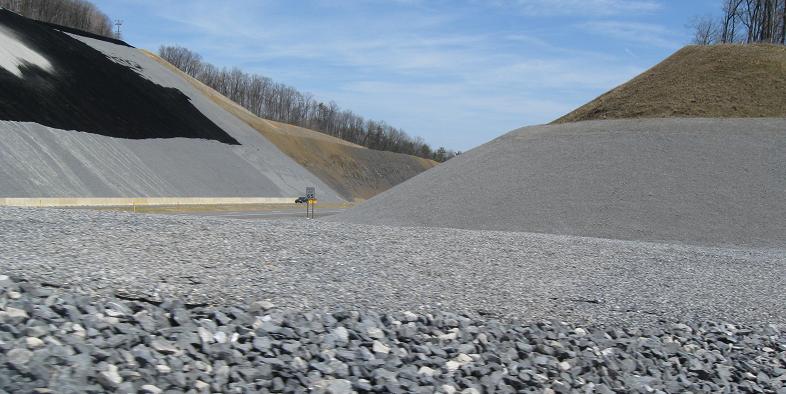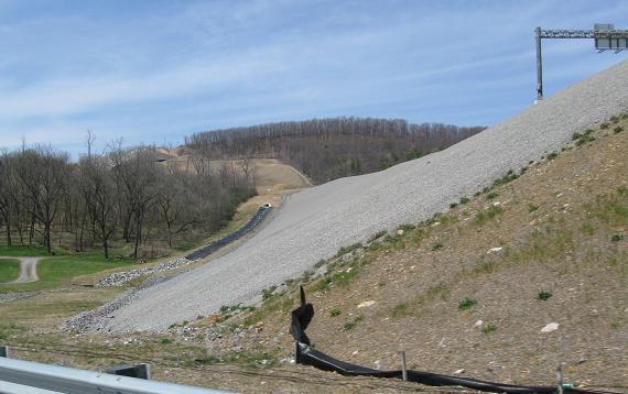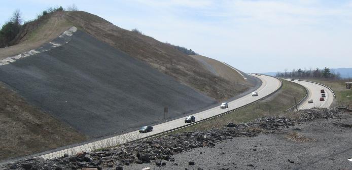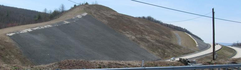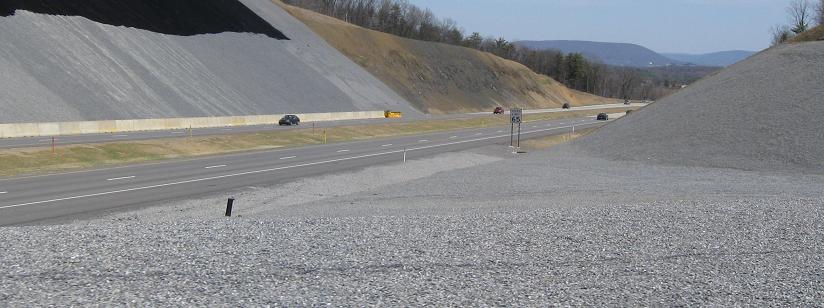 Continuing WB around another megaton of rock, coming right up on the formation you saw in the first photo on this page. As crews were constructing the Appalachian Thruway (I-99), they discovered that the rock was a lot more acidic than they expected. This led to delays in completing I-99 in the Port Matilda area until engineers could figure out how to remove the rock without leaching acid into the groundwater and how to build a road on the remaining rock while protecting it from the groundwater. Part of the solution was pouring as much good rock as could be found all over the place. Anywhere there's a slope near Bald Eagle Mountain, there's gravel all over it and a protective tarp beneath, hiding the worst of the acid from the light of day. Unfortunately, while this is a practical solution, it leaves some aesthetics to be desired.