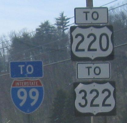 A rare appearance of the PA font in a new shield for I-99, and another tall overpass as old US 322 WB and old US 220 SB come to the bottom of the hill near Port Matilda.