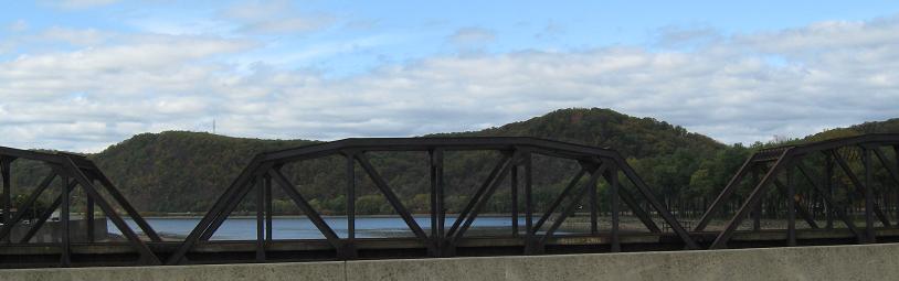 Looking west at the parallel railroad on both sides of Lyon's Island as I cross from Sunbury to Northumberland over the North Branch of the Susquehanna River.
