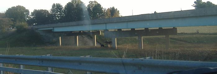 Crossing the EB overpass and continuing east. Beyond those trees, the ROW curves left toward PA 772.