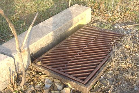 A storm grate on the east side of the EB overpass, which has no pavement to drain. Since this grate would be flush with the left shoulder of PA 23 EB, you can see how much grass and soil would need to be cleared to lay the pavement bed. I wonder how much has grown, washed in, or been planted since this overpass was constructed, and how much was simply left in place waiting for the order to pave.