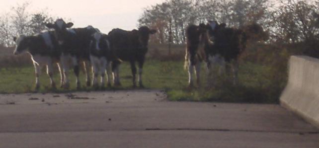 The cows made it all the way up to the wire that miraculously (for me, anyway) keeps them from crossing the overpass. They are none too pleased to share their fallow turf with wanton photographers. Thanking my lucky stars I made it across the wire in time and they didn't, I quickly beat a retreat back to my car and shakily headed off to the last prize of the day. Photos continue via the big link below.