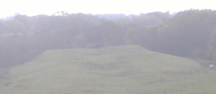 Looking west from the next overpass down, Hartman Station Rd., which crosses the Goat Path at an angle. The aforementioned bend in the ROW blocks sight of Willow Rd.