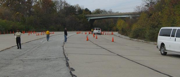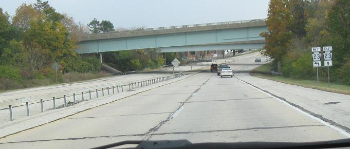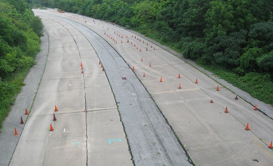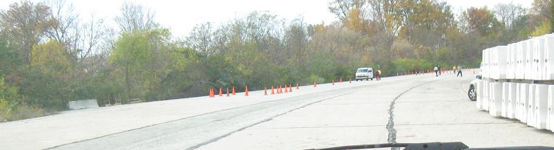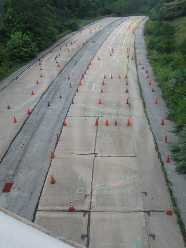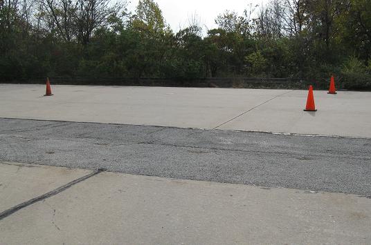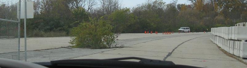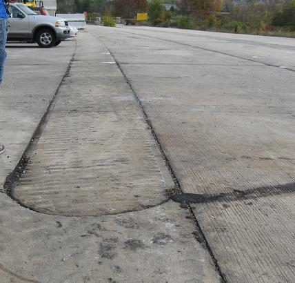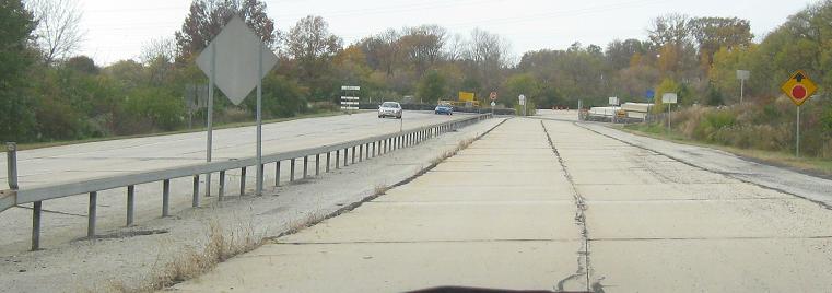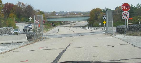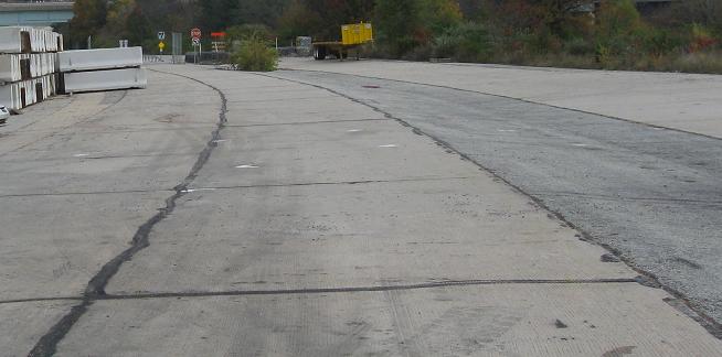 Eastbound out of the stub area, taking a close look at the ribbed concrete gore area that then widens to include an asphalt gore area.