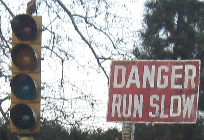 Clearly someone with an affinity for road paraphernalia has encamped here. The octagon isn't exactly legal for display (all octagons must be stop signs), but every time the guy exits his driveway he breaks the "one way traffic" law. I stuck around for a minute, and the signal never changed. I guess it really does run slow.