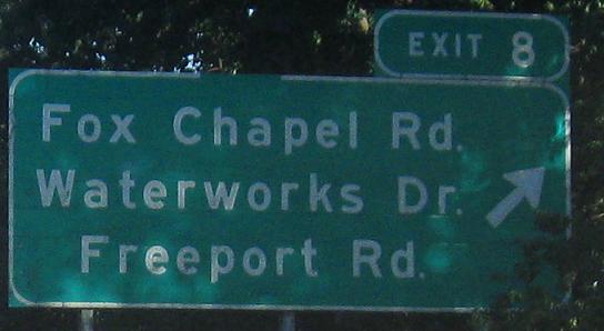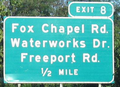 SB signs at the Highland Park Bridge, which is a wye toward the river (left) so thru traffic must keep right. The bridge is the way to PA 8 SB; the next bridge to the southwest is actual PA 8, but why go all the way out and back?