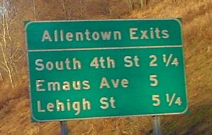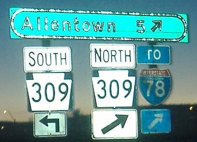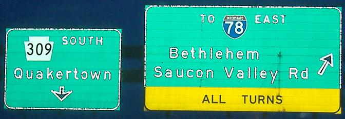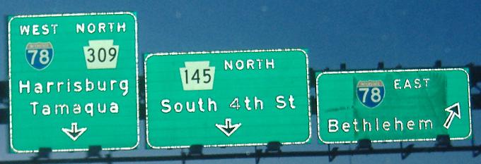This looks just like the sign on I-78 West for these roads. Maybe that's because these are all exits from I-78 West. South 4th St. is actually PA 145, which is the continuation of PA 309 straight into Allentown and beyond, while the other two streets are from the I-78/PA 309 duplex. PA 145 is NOT just former PA 309, but a legitimate route in its own right.