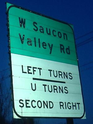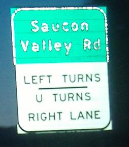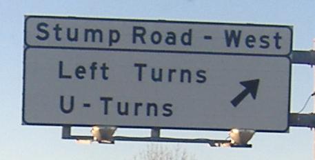 New white sign, old white signs (ignore the camouflaged ad). Just because there are U-turns doesn't mean the sign needs to be white - the first one is leading to Stump Road and thus should be a typical green color.