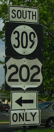 The Airport Square shopping center has gone the opposite direction from PennDOT, first demoting PA 309 to a mere NJ 309 (and a narrow one, at that), and then demoting US 202 to PA 202. As you can see, this is right by the PA 463 intersection, and what you can't see is that this is courtesy Scott Colbert.