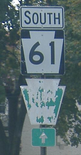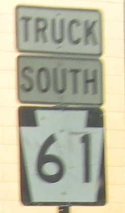 A few photos SB in Reading, where PA 61 ends at Business US 222 (which is how one reaches the PA Turnpike, or via I-176). The first is an old street sign at Robeson St., the second is an original Turnpike trailblazer that needs to be replaced, and the third is a standard PA historical sign.