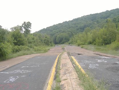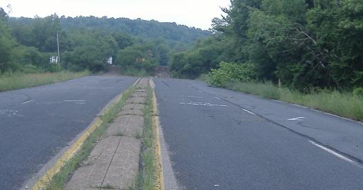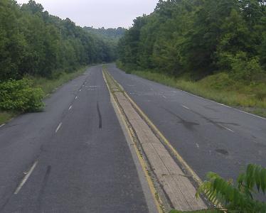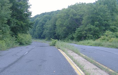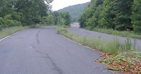 Around the curve, over the mound, and back to normalcy. Straight ahead, PennDOT makes it as obvious as possible where the old highway continued, even leaving some concrete median as a clue. And, amazingly, there is the car that will take the bicycle back home with me, just when I needed it most.